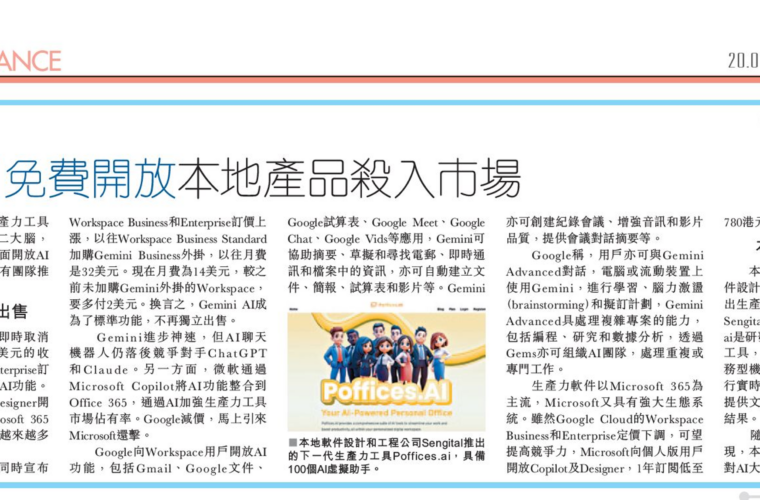 We are excited to announce that our AI productivity tool, Poffices.ai, has been featured in Singtao's recent article titled "數碼轉型 大廠AI免費開放 本地產品殺入市場", published through Making HK IT!.